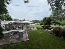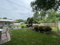 overlooks a beautiful back yard that is fenced in, a