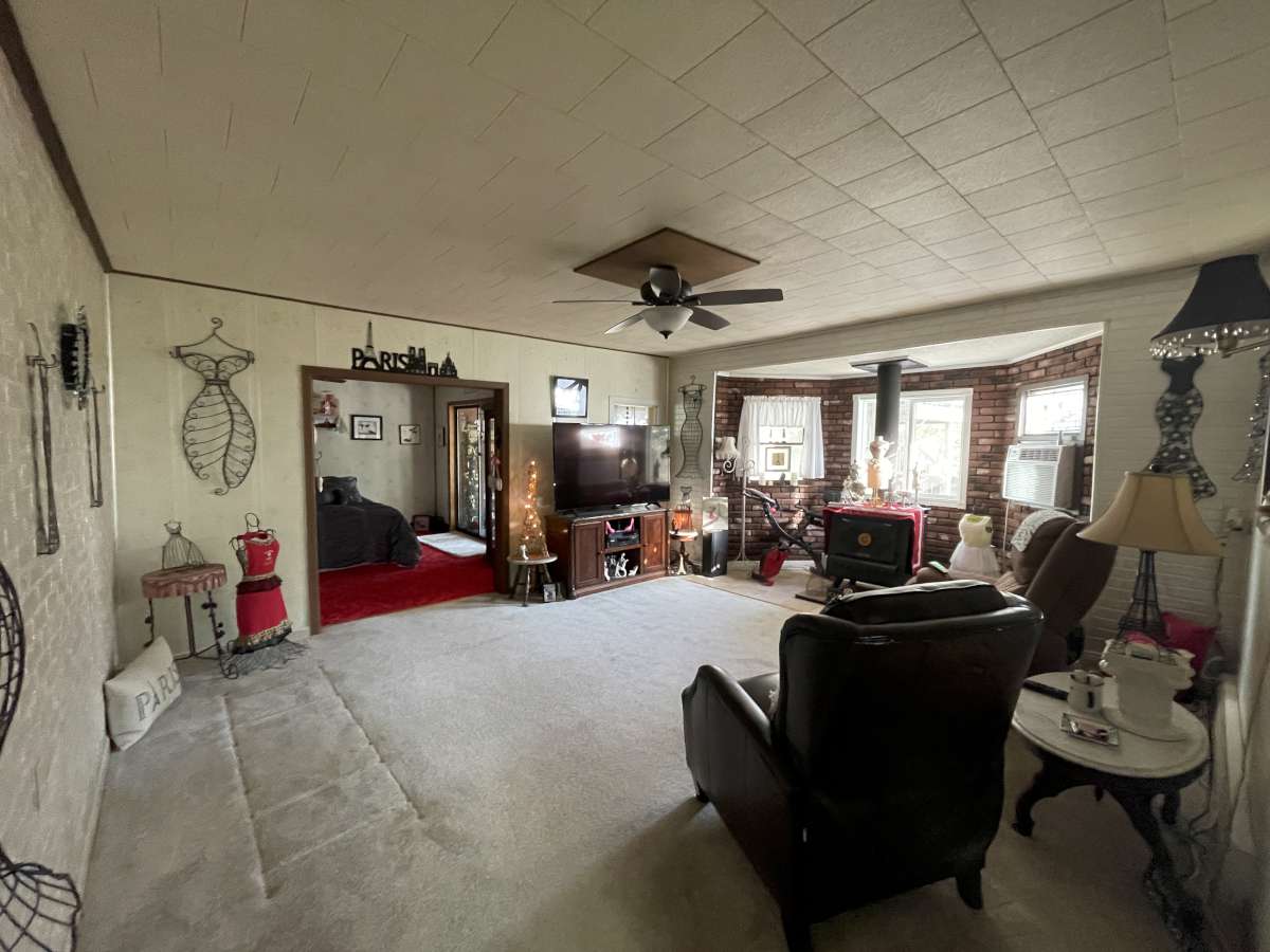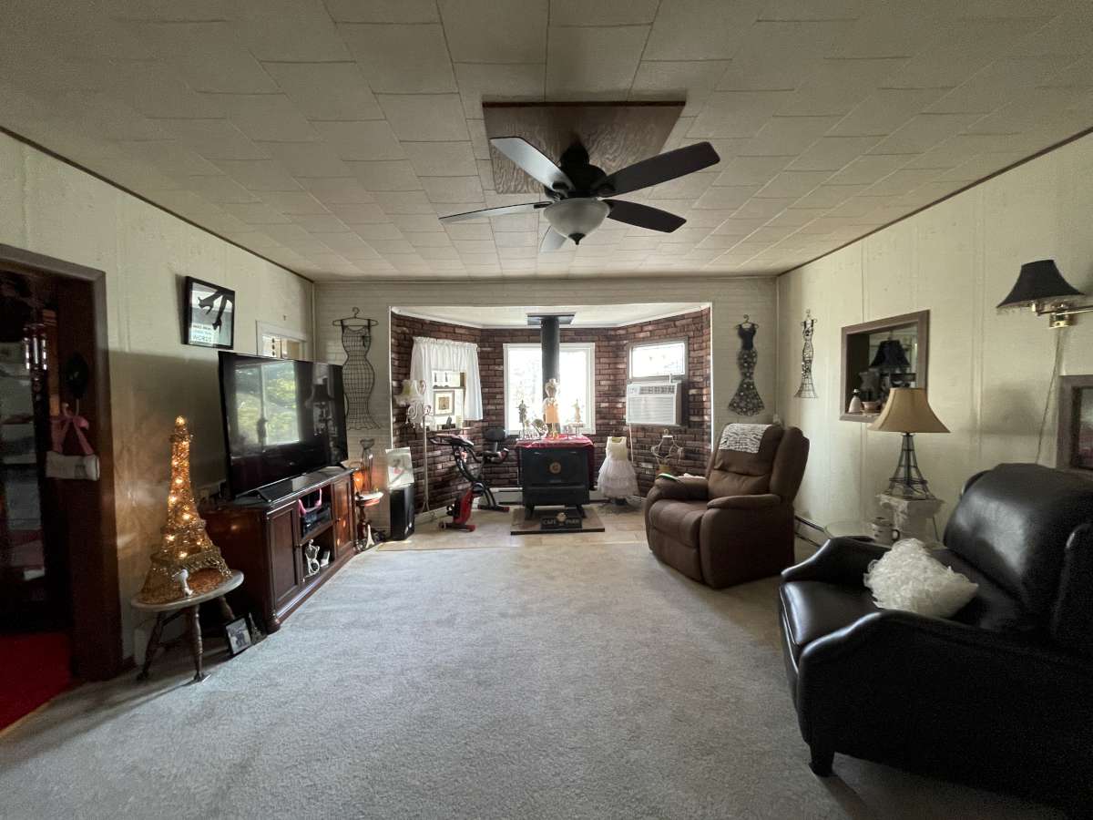room, a living room w/ wood burning fireplace, & a